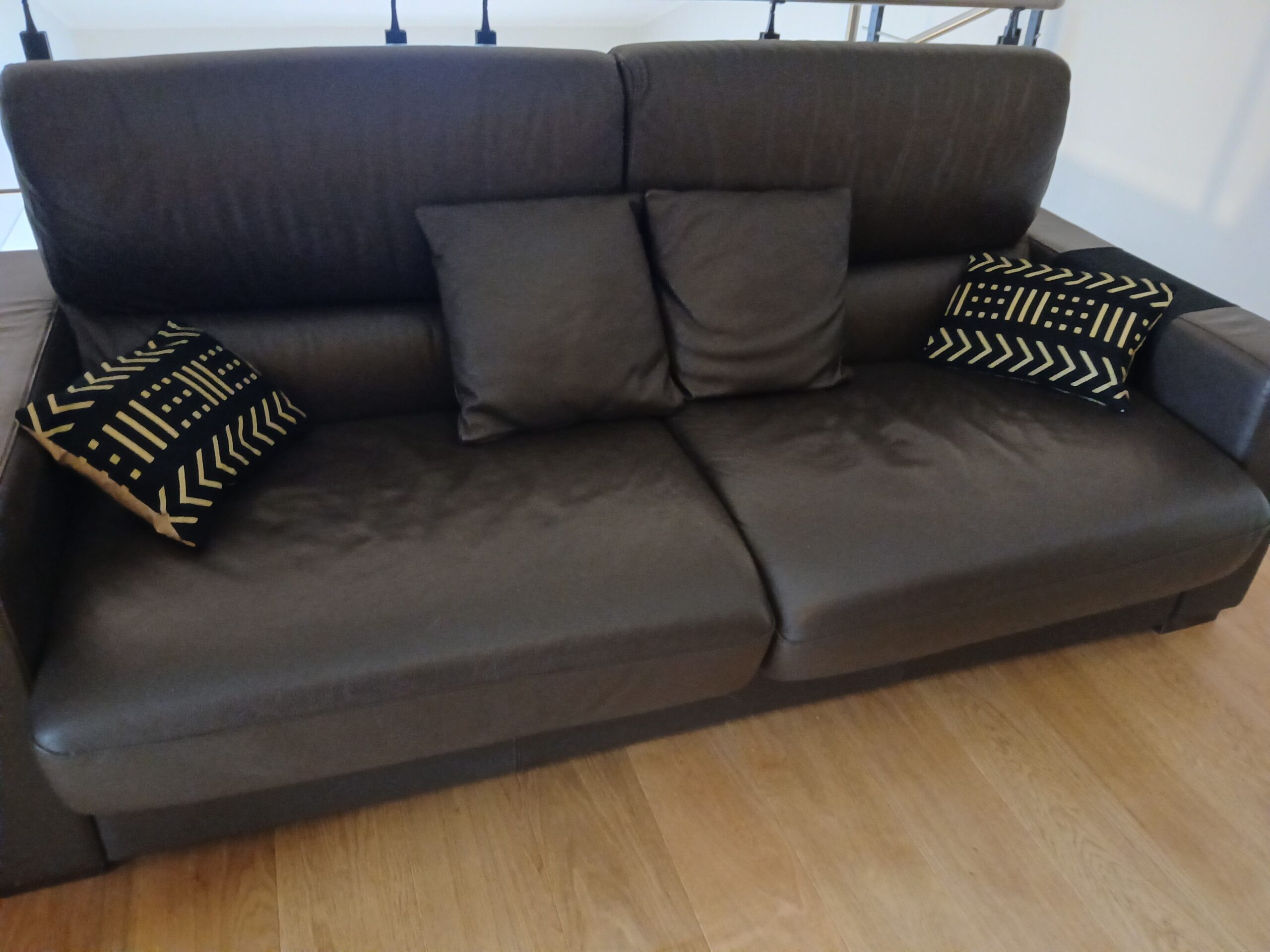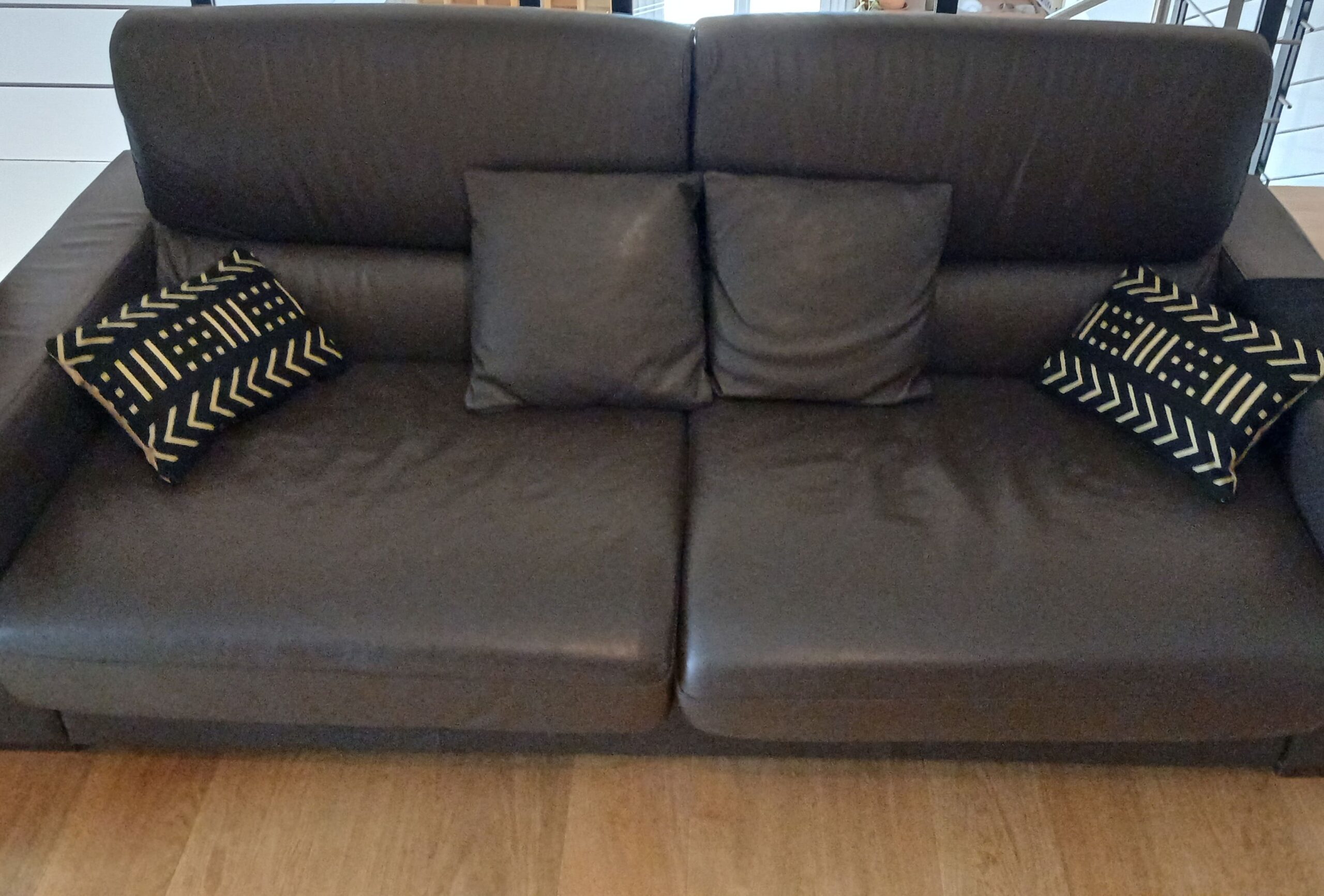 Ces coussins bifaces associent un recto inspiré du bogolan — textile emblématique d’Afrique de l’Ouest — revisité en wax dans un duo raffiné de noir profond et de beige minéral, à un verso en bazin riche beige.