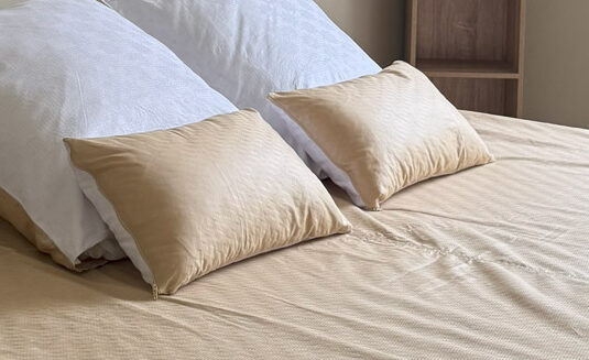 La face colorée unie met en valeur un beige vintage au charme patiné pour une atmosphère douce et sophistiquée, en combinaison avec la face blanche pure élégance. La texture satinée et les motifs tissés dans la trame du bazin créent un jeu de reflets qui enrichit visuellement votre décoration.