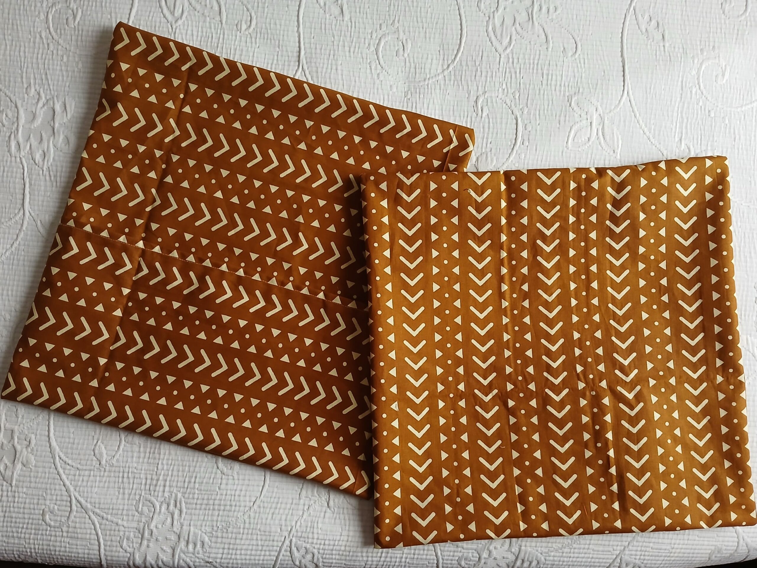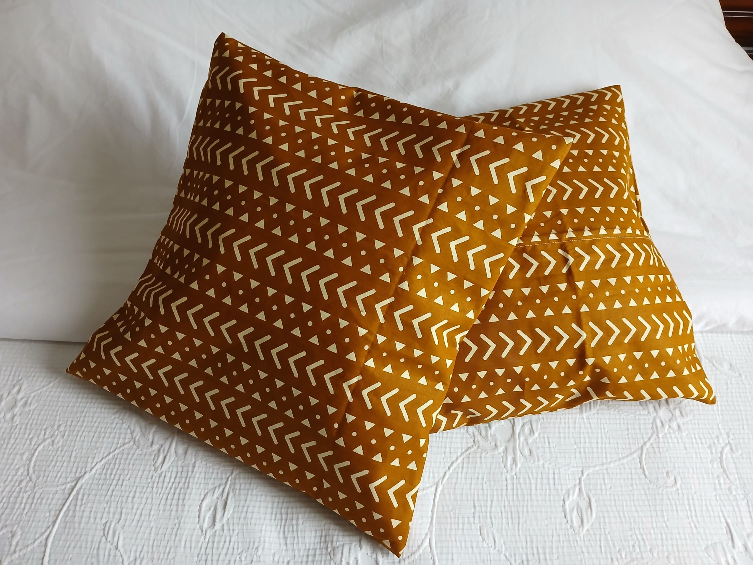 Habillez vos coussins avec ce lot de housses en wax bogolan teinté d’un ocre jaune minéral et solaire à la fois, évoquant les terres et les pigments naturels utilisés dans les bogolans traditionnels. Le motif graphique, à la fois rythmé et symbolique, apporte profondeur et caractère à l’espace.