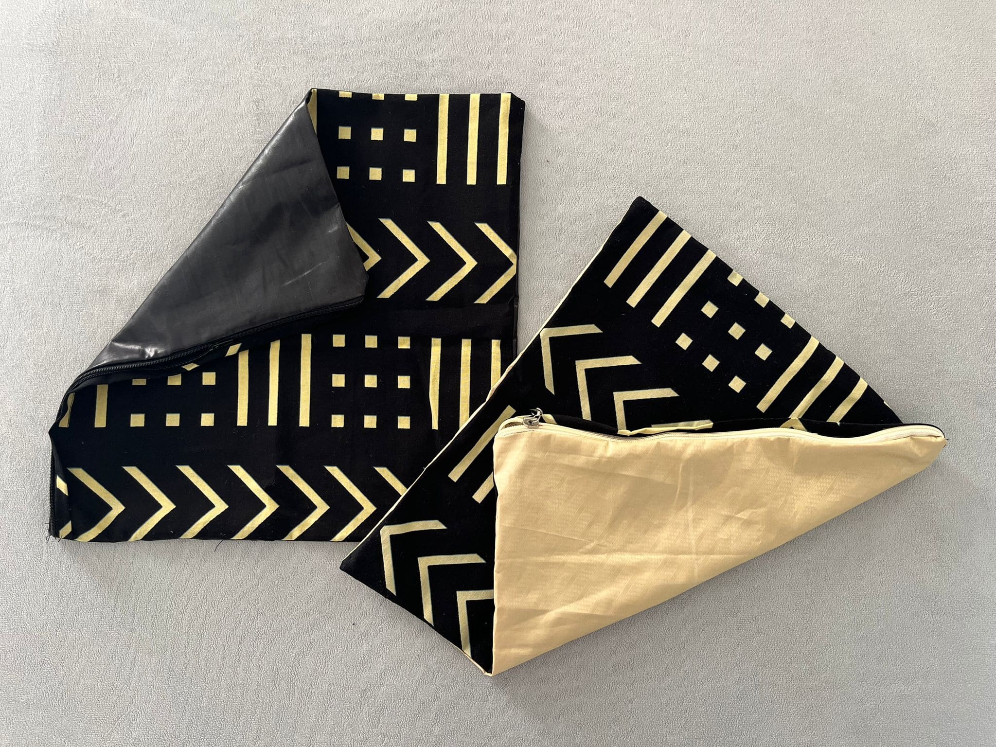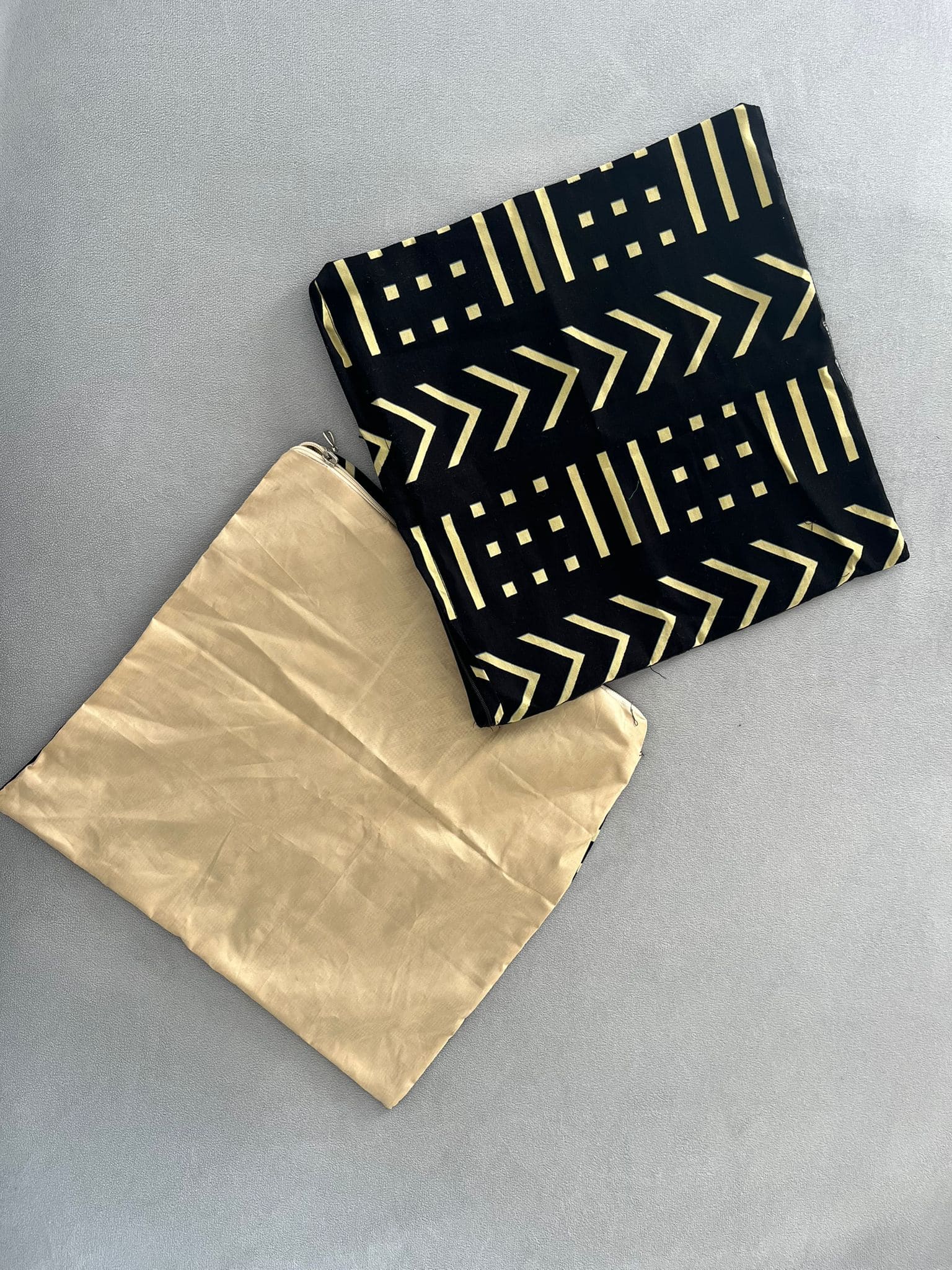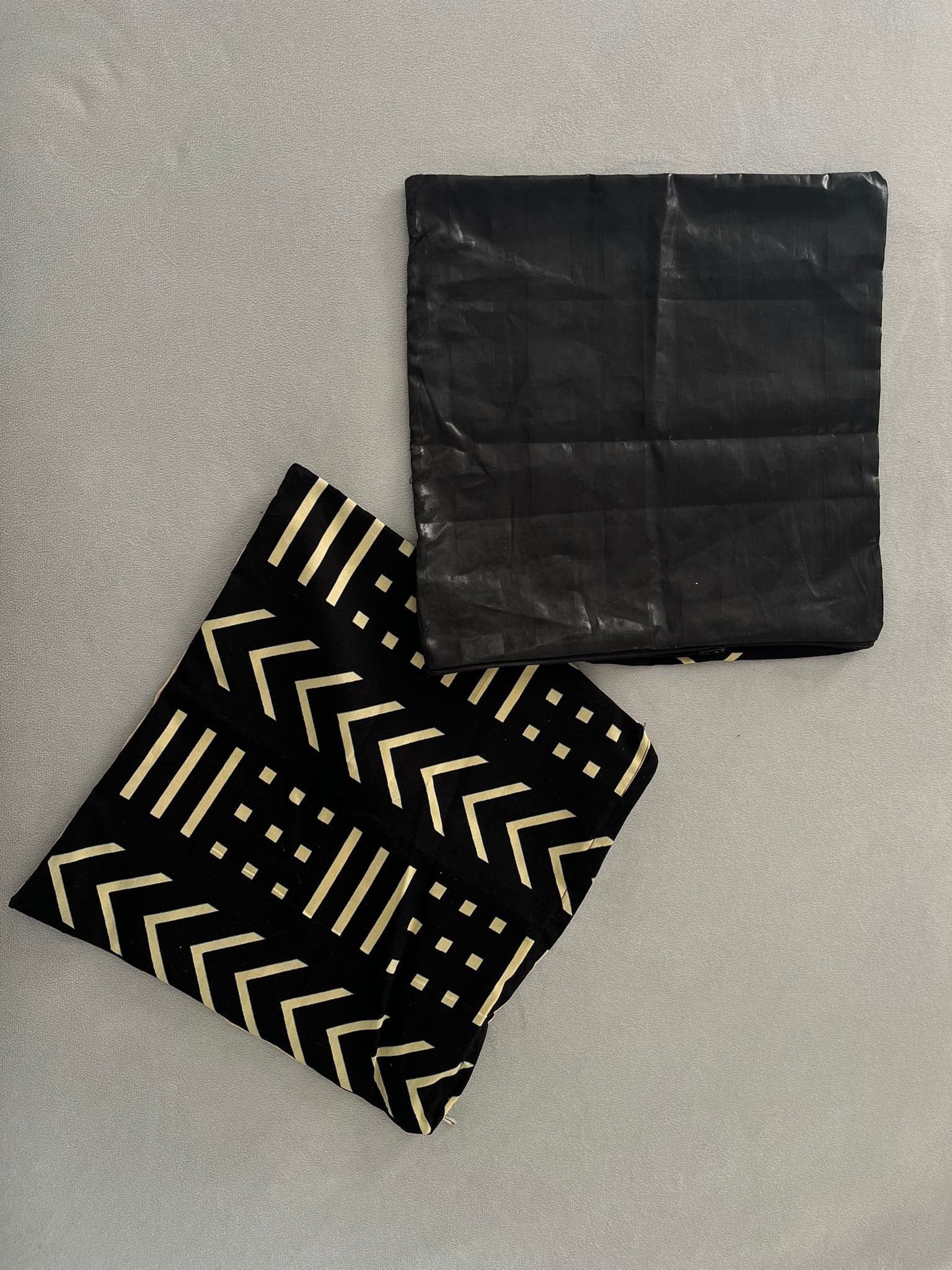 Ces housses de coussins bifaces associent un recto inspiré du bogolan — textile emblématique d’Afrique de l’Ouest — revisité en Wax dans un duo raffiné de noir profond et de beige chaleureux, à un verso en bazin riche, disponible en noir ou en beige.