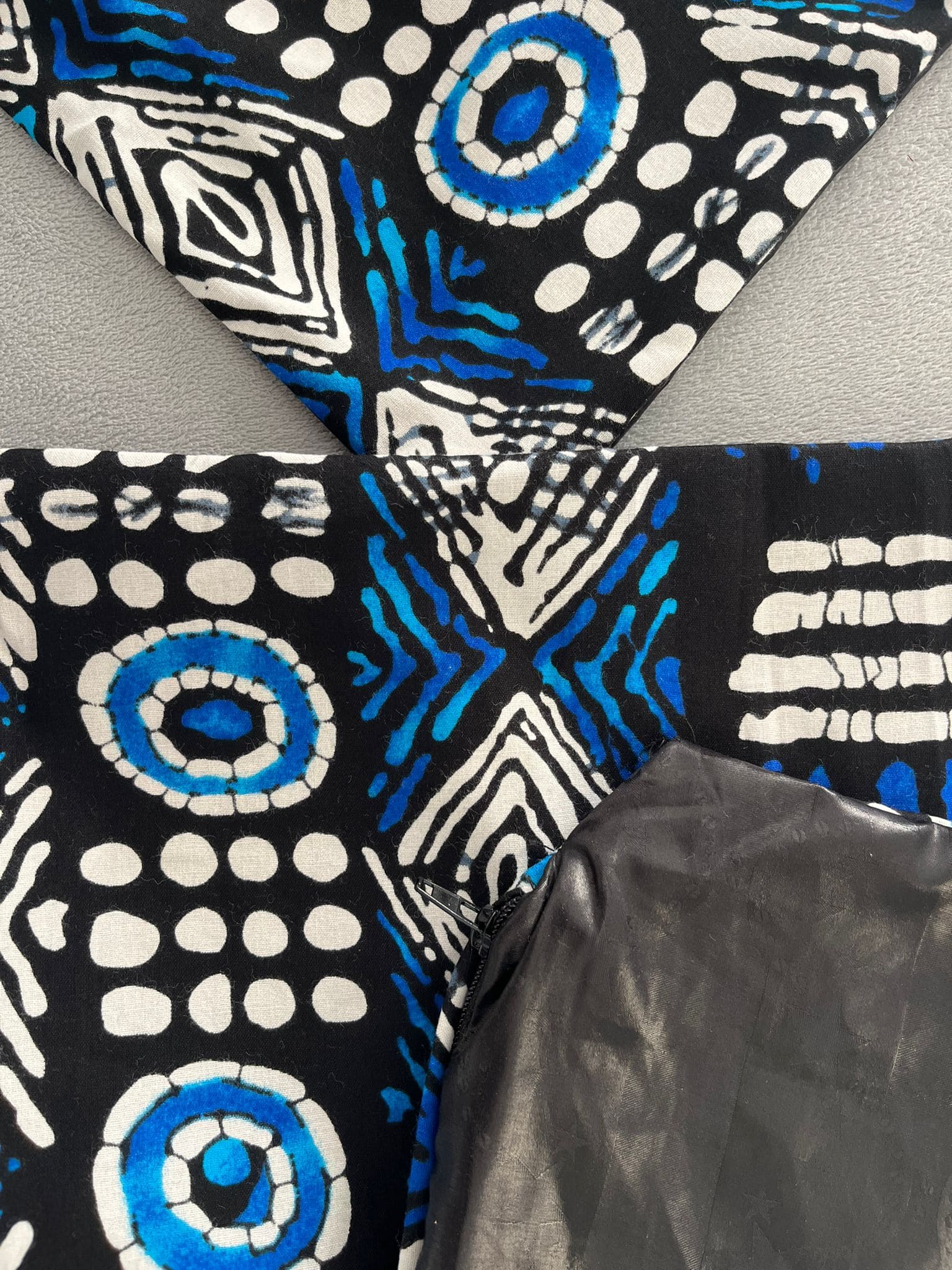Habillez vos coussins d’élégance : Wax Indigo Outremer d’un côté, bazin riche noir de l’autre, pour un intérieur qui ne passe pas inaperçu.