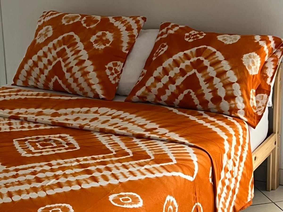 Faites entrer la lumière et l’énergie dans votre chambre avec ce drap en batik artisanal orange, teint à la main selon un savoir-faire traditionnel.