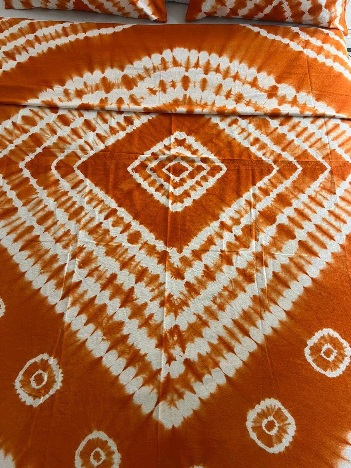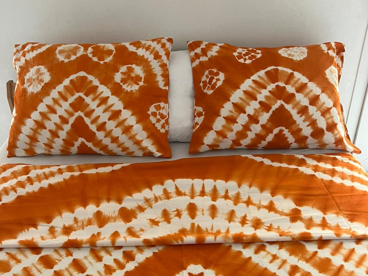 Apportez chaleur et vitalité à votre chambre avec ce drap en batik artisanal orange lumineux.