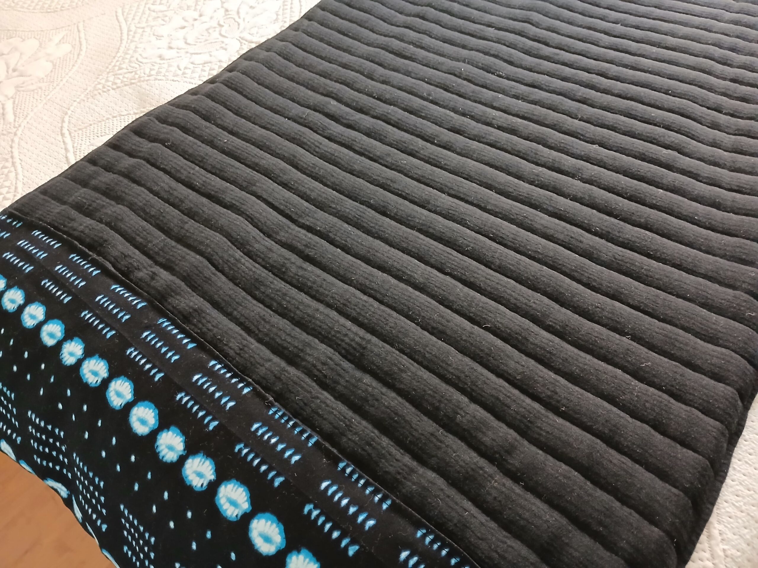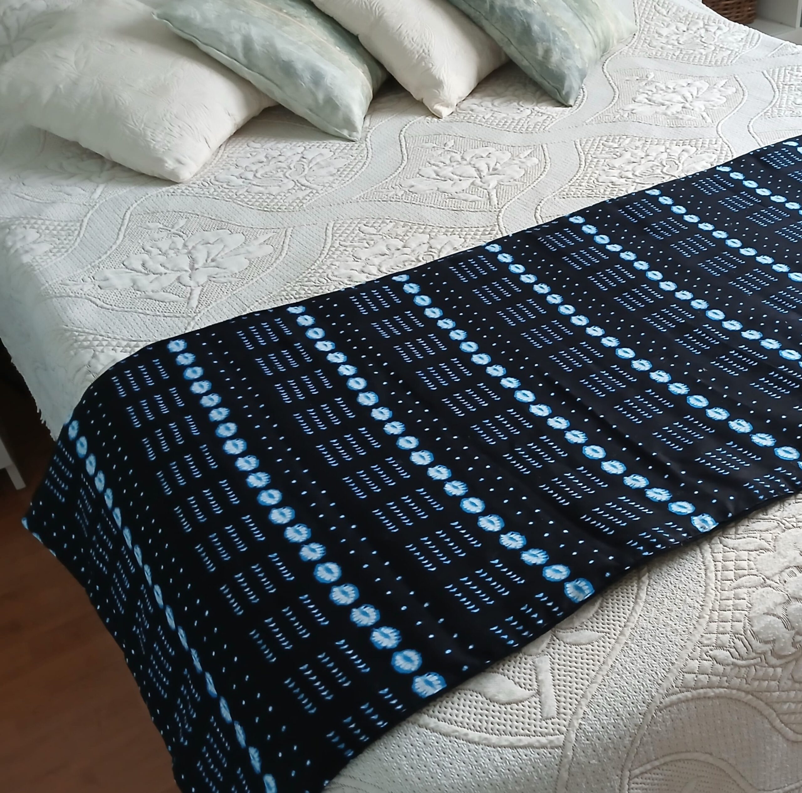 Plongez dans l’élégance ethnique et la douceur contemporaine avec ce chemin de lit Indigo matelassé, illustrant des cauris, symboles de prospérité et de protection dans de nombreuses cultures africaines et asiatiques.