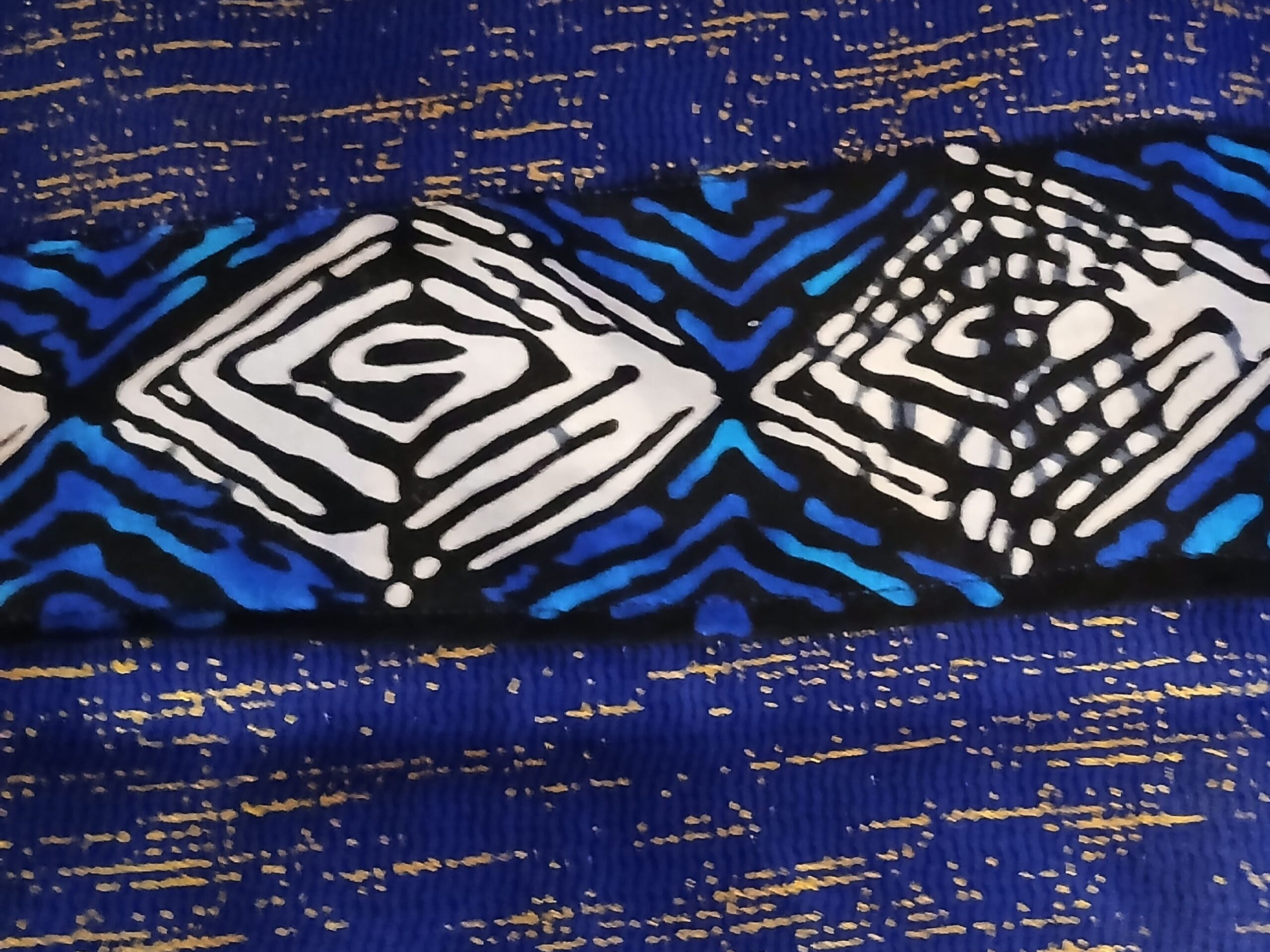 Le Bleu Outremer se mêlent à des touches d’or pour évoquer la chaleur des fêtes et la noblesse du textile africain en parfaite association avec un Wax indigo malien de caractère.