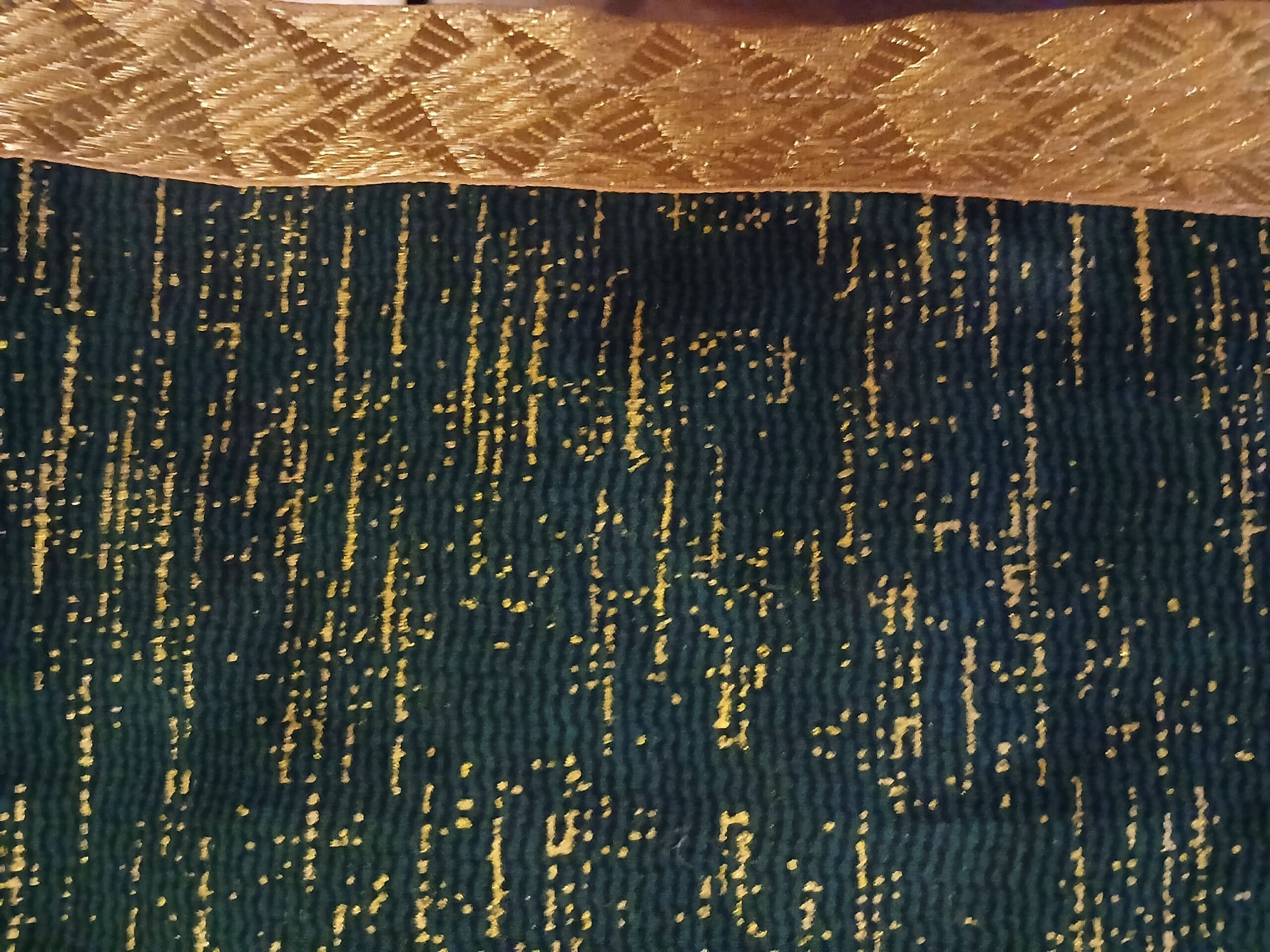 Le Vert émeraude intense, délicatement traversé de fils dorés capte la lumière et diffuse une atmosphère raffinée et chaleureuse. La bordure dorée ivoirienne soigneusement sélectionnée, vient compléter le tissu principal avec justesse et délicatesse.
