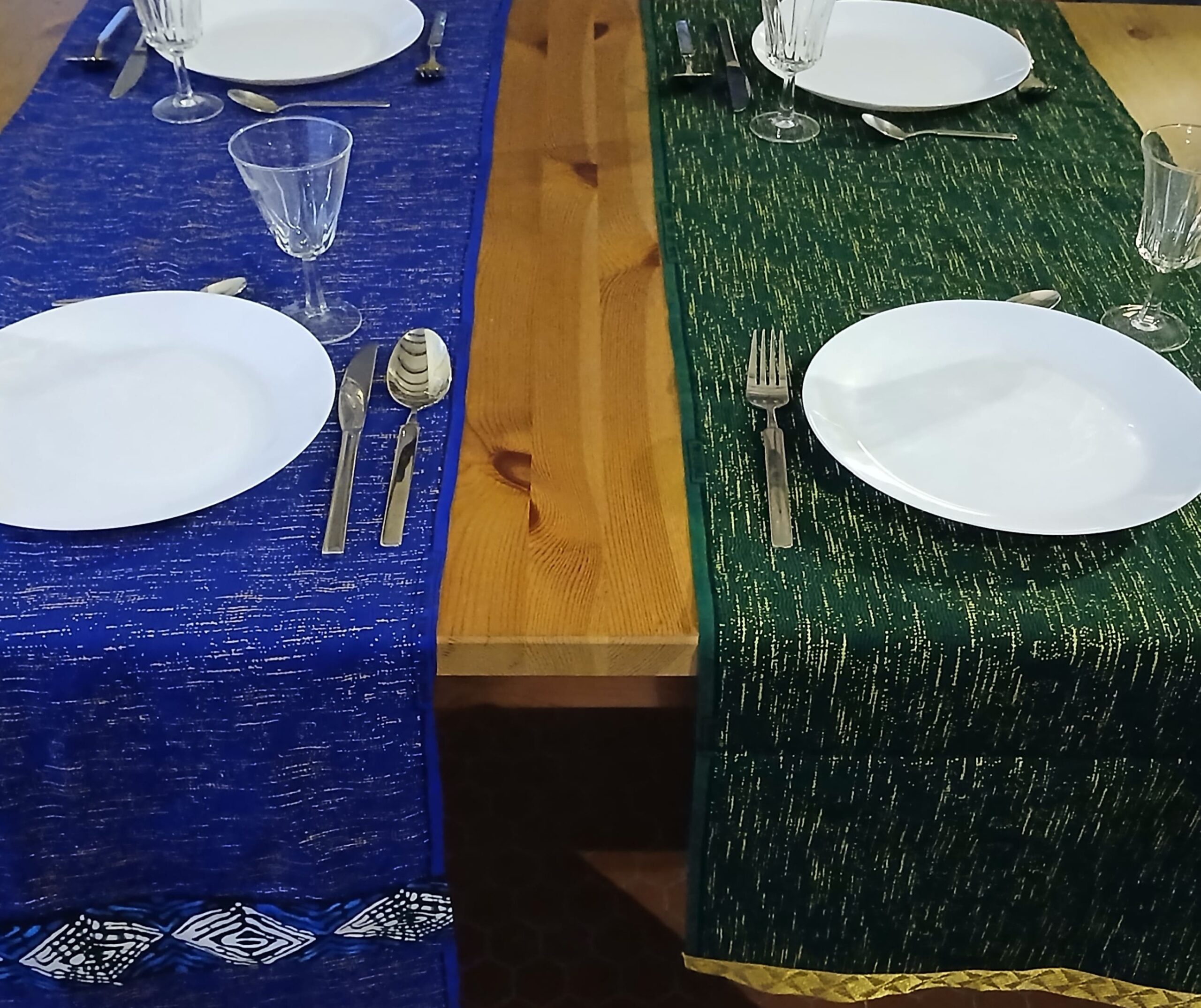 Illuminez vos tables de fête avec les chemins de table Kente Gold, mêlant le charme du wax authentique et l’éclat raffiné des fils dorés.