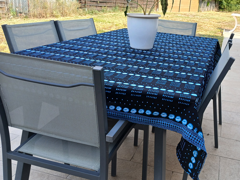 Les nuances profondes d’indigo sont rehaussées de pointillés et de lignes turquoise, offrant un contraste raffiné et apaisant. La nappe est délicatement bordée d’une finition dentelle qui lui confère une touche supplémentaire d’élégance.